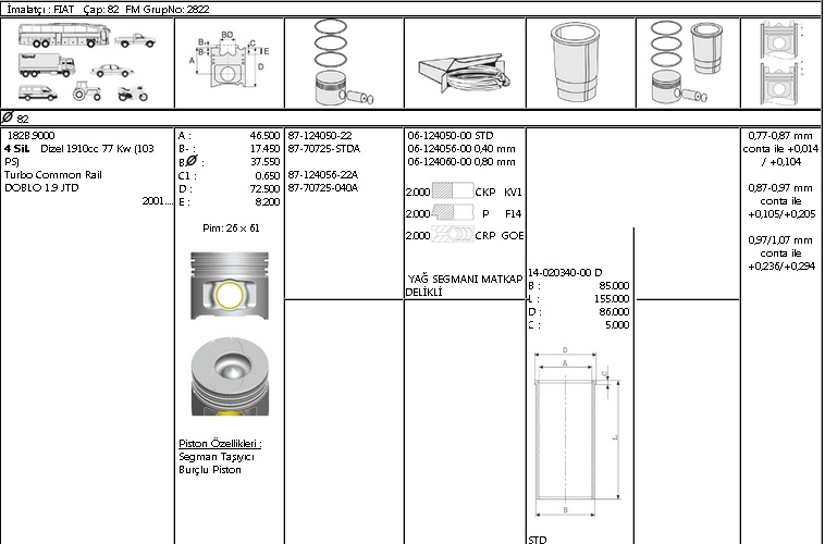 GÖMLEK 40203400 STD 82,0 DOBLO 1.9-D JTD