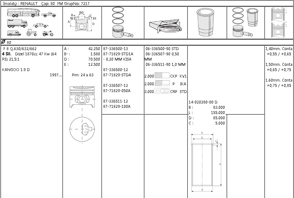 PİSTON SEGMAN 8771829 050 8733650712 80,0 R19 EKSPRES 1.9D F8Q